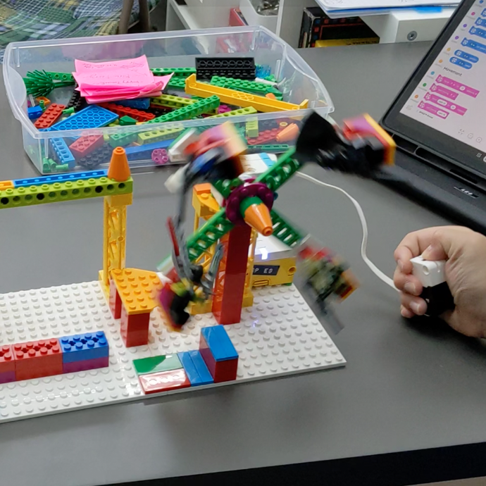 學生透過組裝積木套件與電子元件,建構機械模型並撰寫程式,結合 STEM 知識解決實際問題